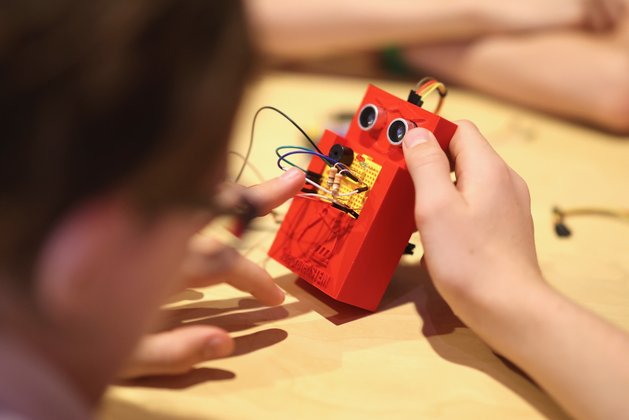 We introduced the students to breadboards and explained how they conduct electricity. With this new knowledge, they wired up the circuit outputs, including two indicator LEDs (one red and one green) and a buzzer to alert when the robot detects an object.